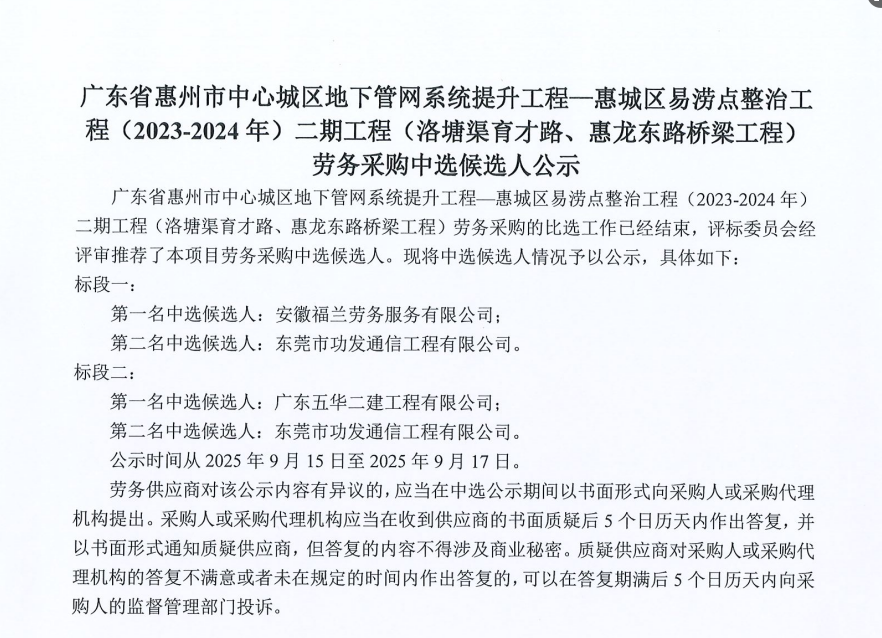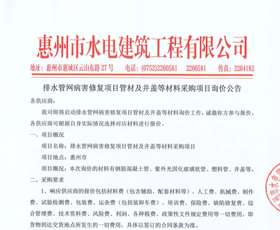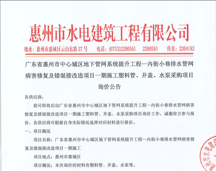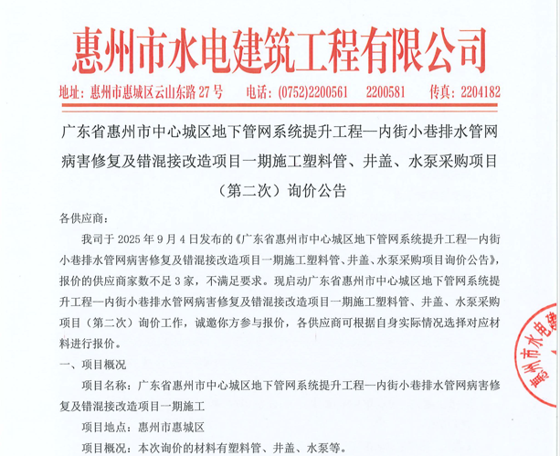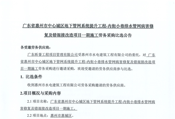廣東省惠州市中心城區(qū)地下管網系統提升工程-內街小巷排水管網病害修復及錯混接改造項目一期施工勞務采購比選公告……
